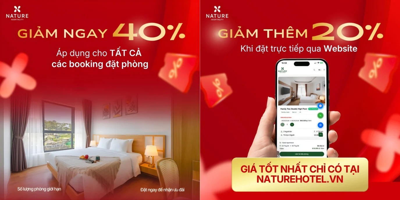 - Giảm ngay 40%: Áp dụng cho tất cả các yêu cầu đặt phòng (booking) trên toàn hệ thống Nature Hotel Hà Nội và Đà Lạt.